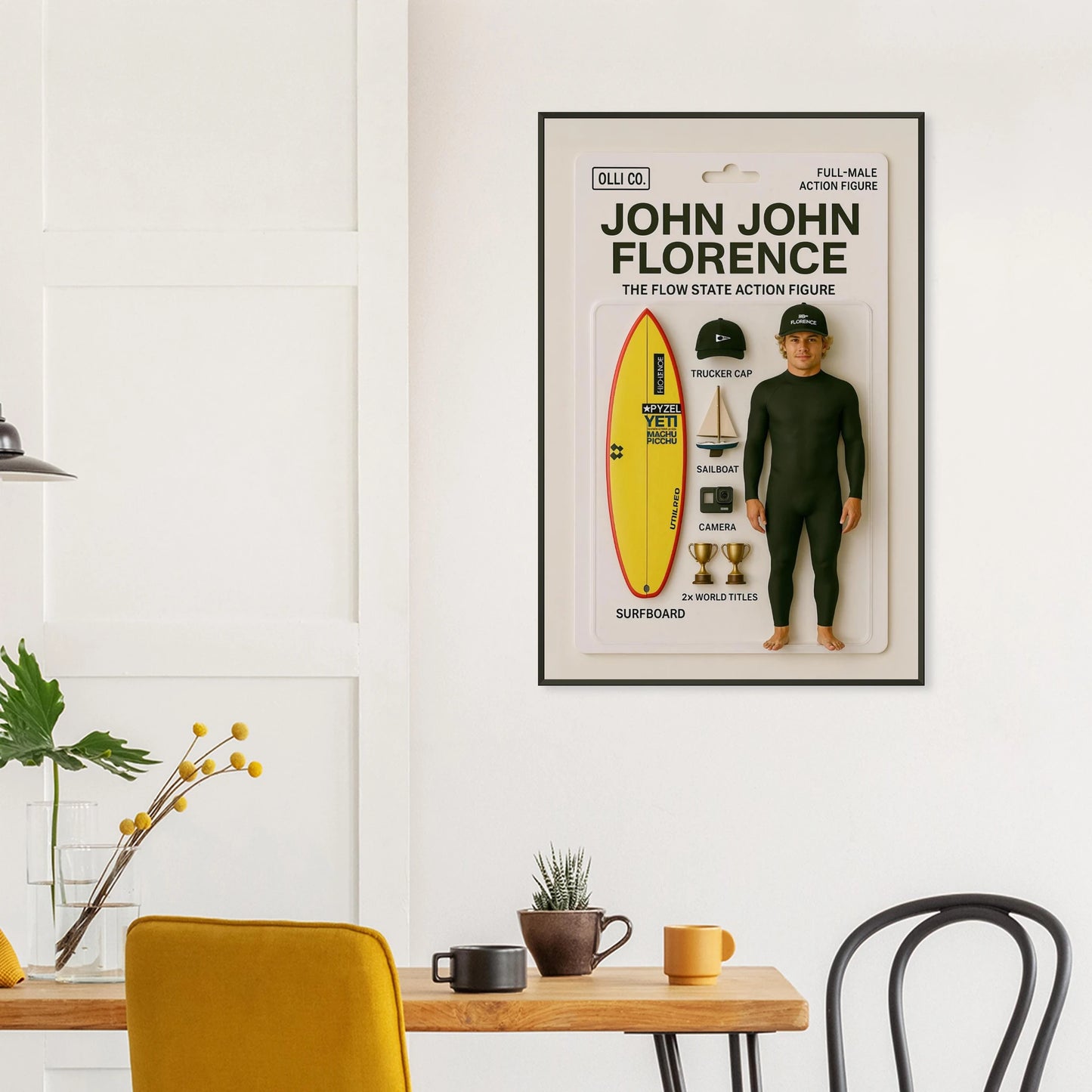John John Florence aus Oʻahu, Hawaii gilt als einer der stilvollsten und technisch versiertesten Surfer der Welt. Zweifacher Weltmeister, Big-Wave-Liebhaber, Segler – und jetzt auch als ikonisches Sammlerposter erhältlich. Dieses Motiv zeigt ihn im Look einer klassischen Actionfigur: mit Signature-Surfboard, Trucker Cap, Kamera, Miniatur-Segelboot und zwei Weltmeister-Pokalen. Reduziert im Ausdruck, fokussiert im Moment – ganz so, wie man ihn aus dem Line-Up kennt. Das Poster ist eine liebevolle Hommage an den Mann, der Surf-Performance neu definiert hat. Perfekt für alle, die den Surfsport feiern – ohne Kitsch, aber mit Charakter. Ideal als Wanddeko für Wohnzimmer, Surfshop oder Office.