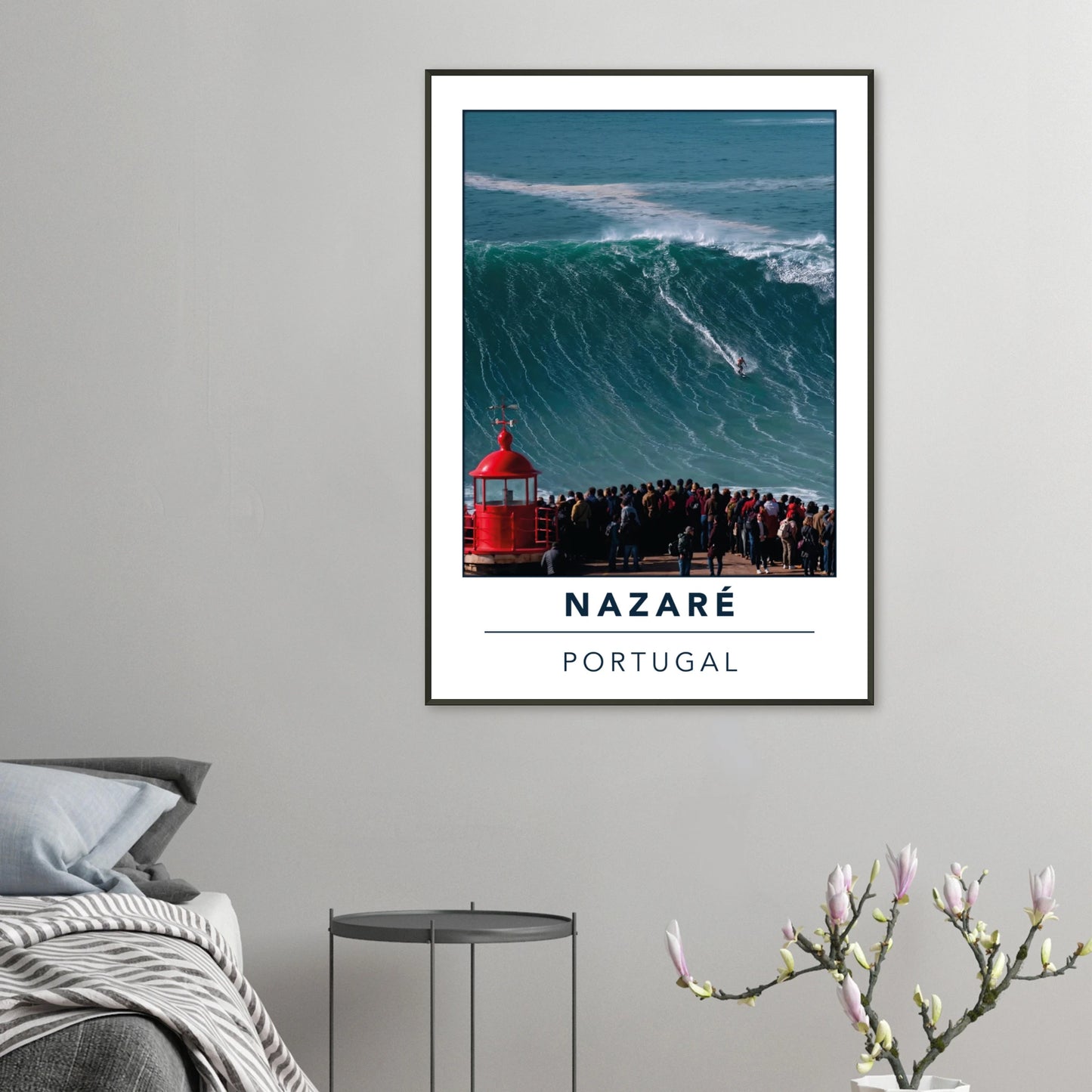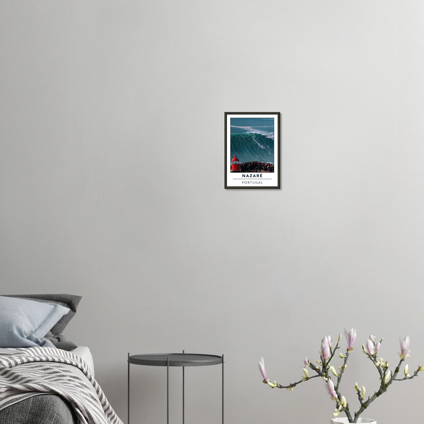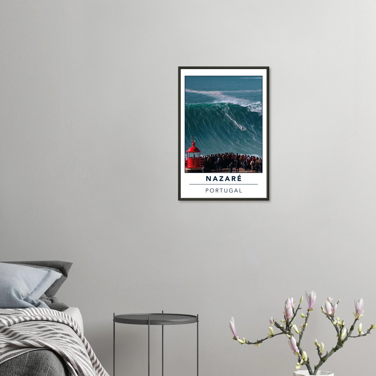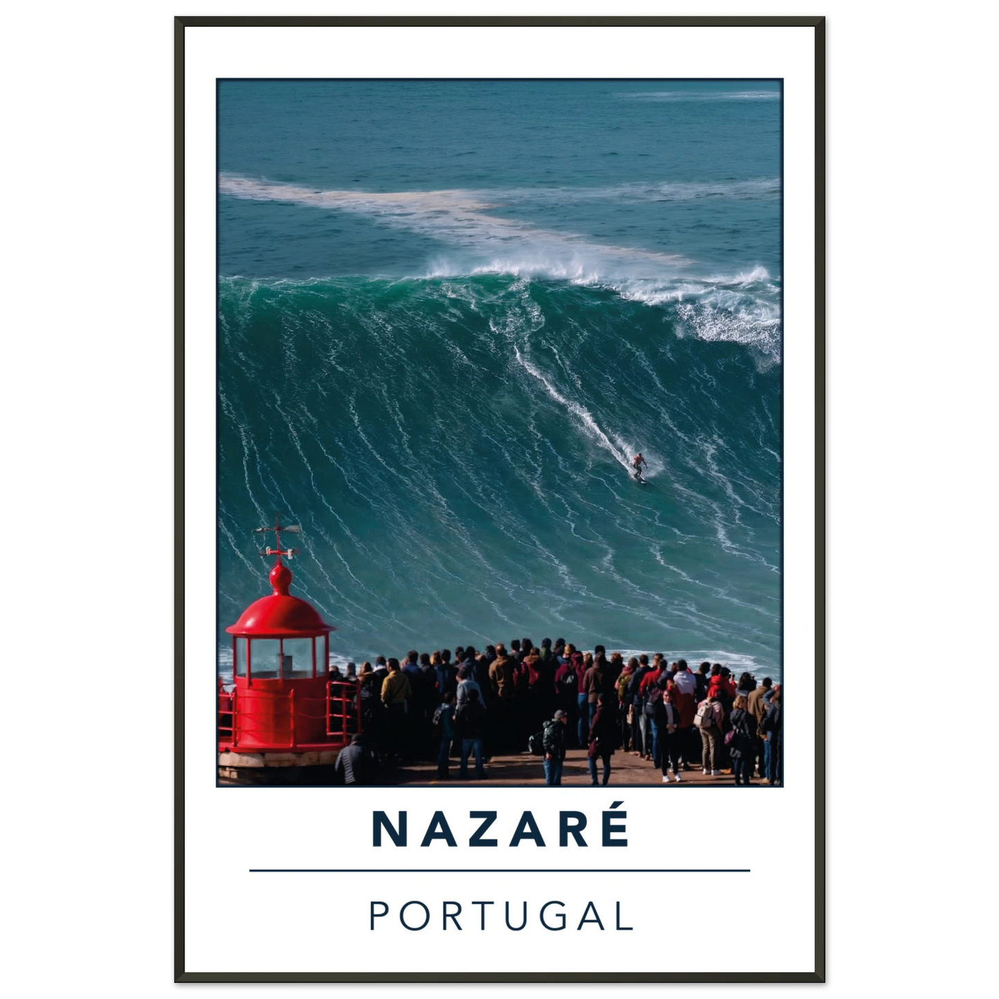 Nazaré gilt als der legendärste Big-Wave-Spot der Welt und ist Schauplatz eines der spektakulärsten Surf-Momente aller Zeiten. Dieses Plakat zeigt Sebastian Steudtner auf dem Weg in die Geschichte – beim Ritt auf einer der größten Wellen, die je gesurft wurden. Die Szene mit dem roten Leuchtturm, den staunenden Zuschauern und der monumentalen Atlantikwelle fängt einen Moment ein, der bis heute weltweit für Staunen sorgt.